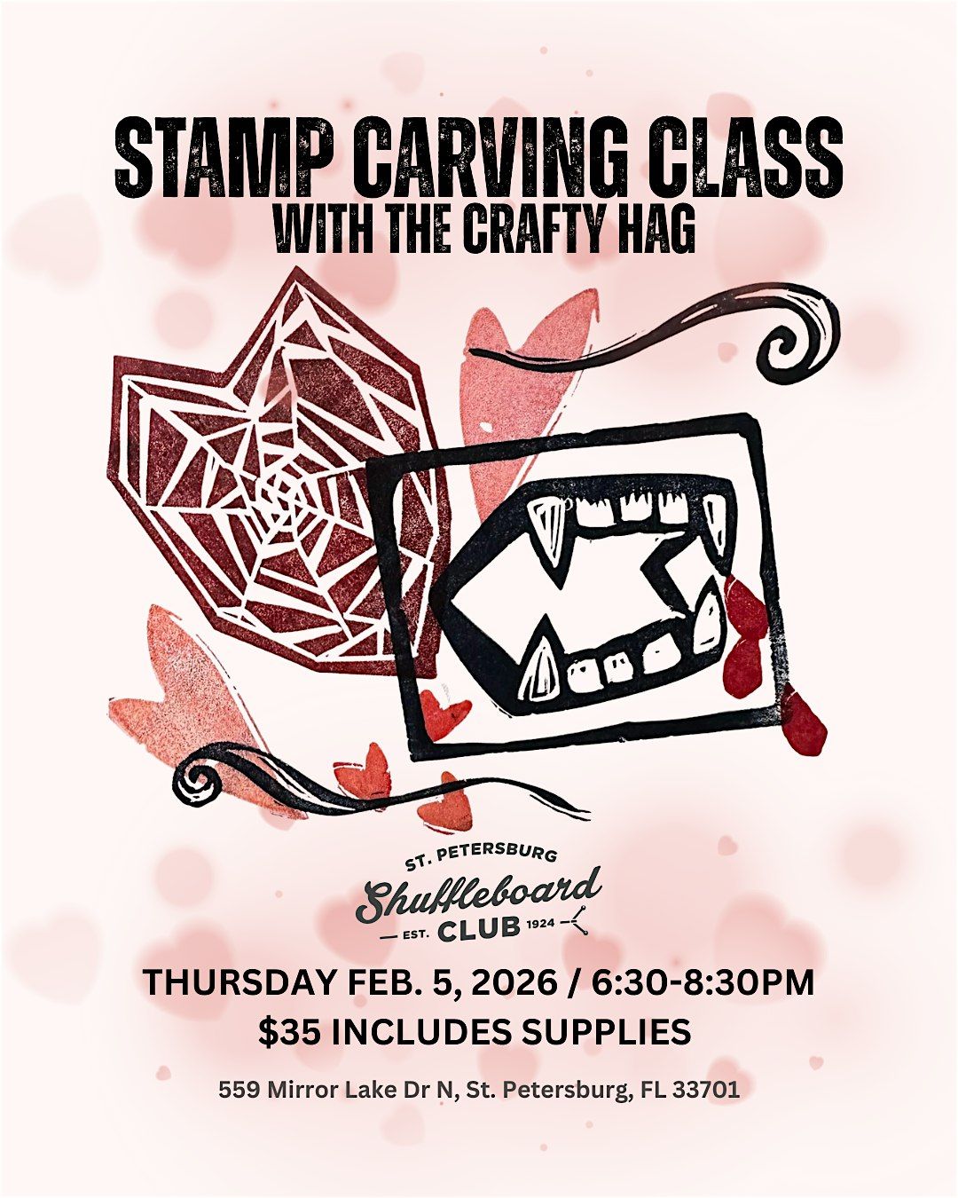 Learn to carve rubber stamps with Coralette/The Crafty Hag. Class fee includes supplies and use of tools. For ages 14 and up. RSVP early!