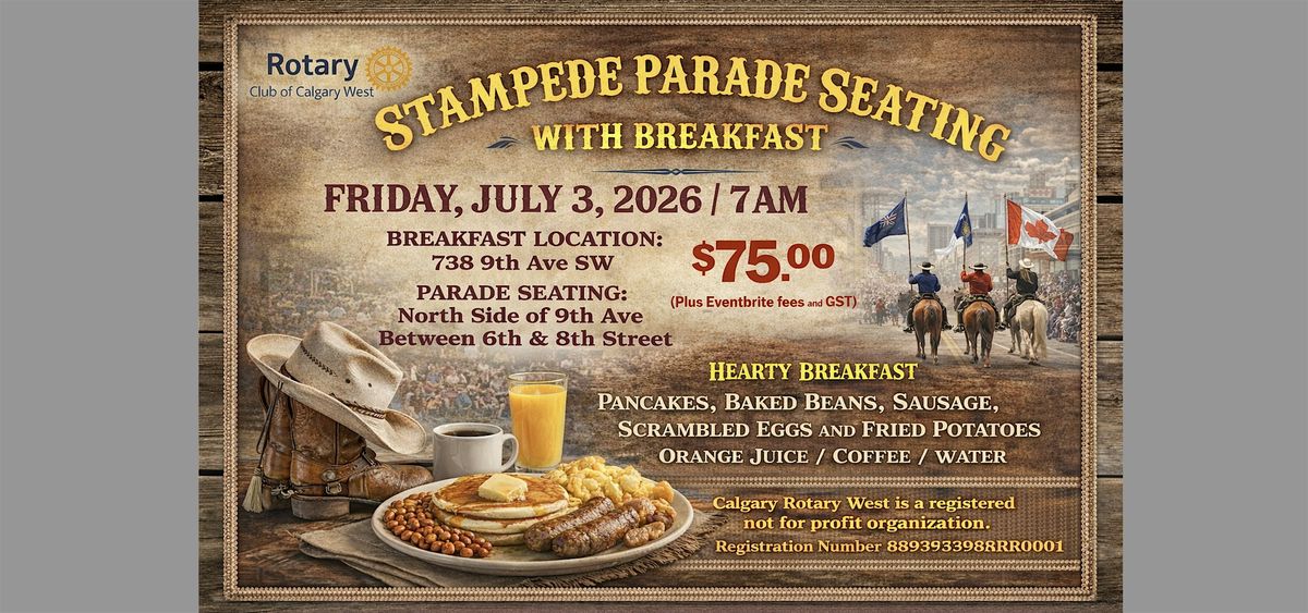 Join people from around the world at The Calgary West Rotary Club's annual Stampede Parade Breakfast on Friday, July 3rd, 2026. Breakfast served from 7:00am - 9:00am. Parade to follow. The breakfast quickly sells out so click on TICKETS to purchase yours today. Don't miss out on the fun!