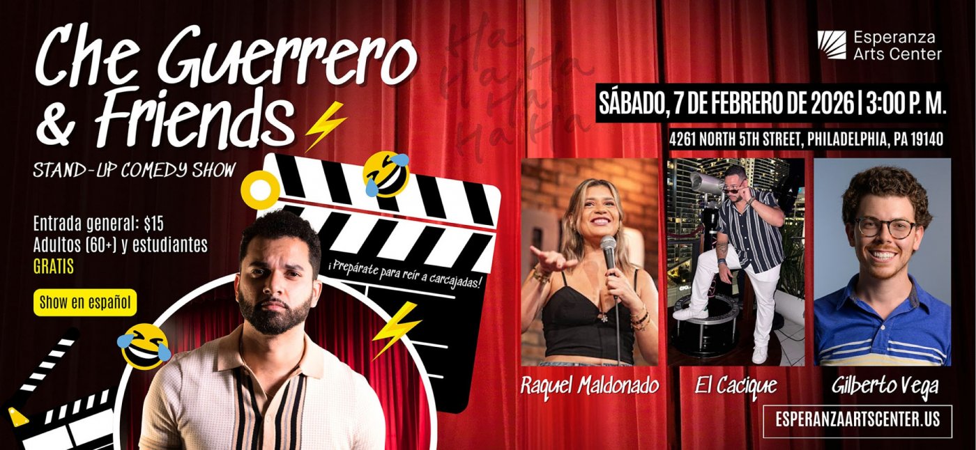 Hosted by Dominican comedian from Philadelphia, Che Guerrero, the show presents a night of Spanish-language comedy featuring standout Latino comics: Raquel Maldonado, a Venezuelan comedian; El Cacique, a Venezuelan comedian and producer; and Gilberto Vega, the show’s host, born in Pennsylvania with Puerto Rican and Costa Rican roots.