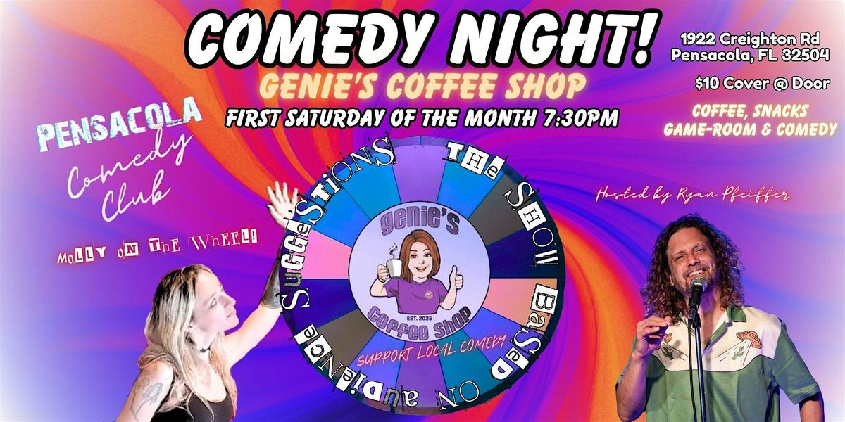 Welcome to Stand-up At Genie's Coffee First Saturdays presented by the Pensacola Comedy Club! Get ready for a hilarious night at Genie's Coffee Shop the first Saturday of the month. The show starts 7:30, doors at 7 pm. Join us for a SATURDAY NIGHT filled with laughter and good vibes. Don't miss out on the chance to enjoy some top-notch comedy in a cozy setting. Grab your friends and come on down for a great time!