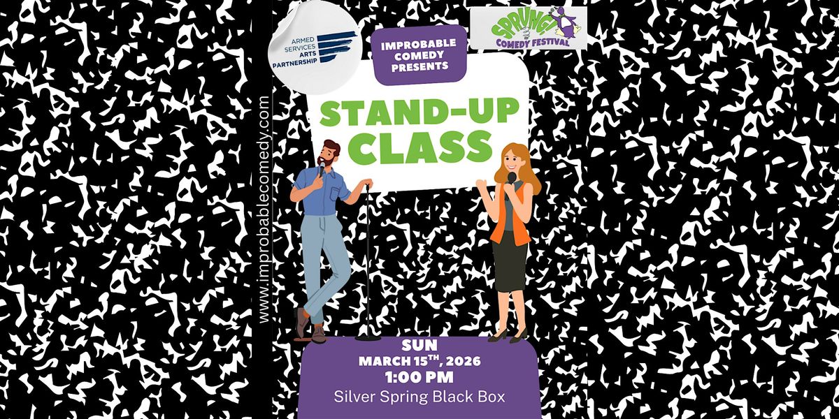 This class is part of SPRUNG! Comedy Festival in partnership with the Armed Services Arts Partnership. SPRUNG! which is Silver Spring's very own comedy festival. Over four nights in March 2026, Improbable Comedy will present SPRUNG! 10 unique shows of hilarious comedy at the Silver Spring Black Box Theatre, along with comedy classes and events.