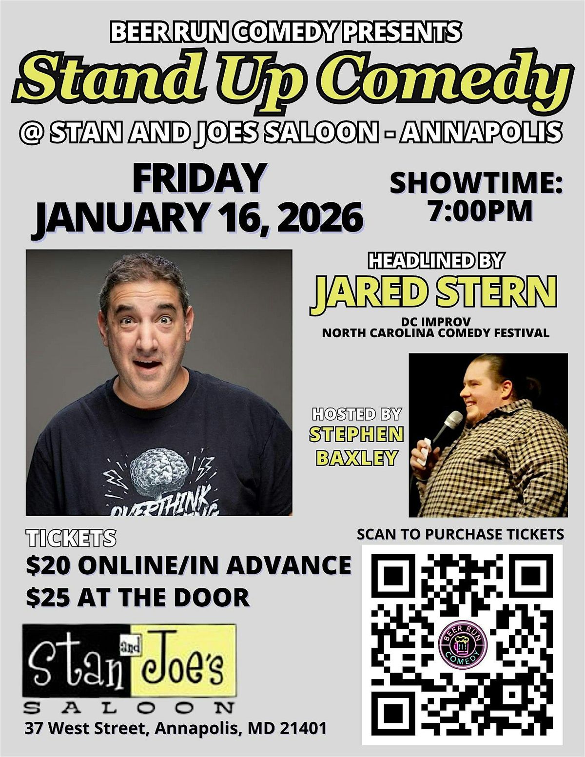 Beer Run Comedy, stand up comedy at its finest, presents their monthly series at The Lounge @ Stan and Joe's Saloon in Annapolis, MD on Friday January 16, 2026 at 7:00pm!!! The show will be headlined by Jared Stern (DC Improv, North Carolina Comedy Festival)! Tickets are $20 online, and $25 at the door. So come to beautiful Annapolis for drinks and to enjoy what is sure to be a riotous evening of laughs!!!
