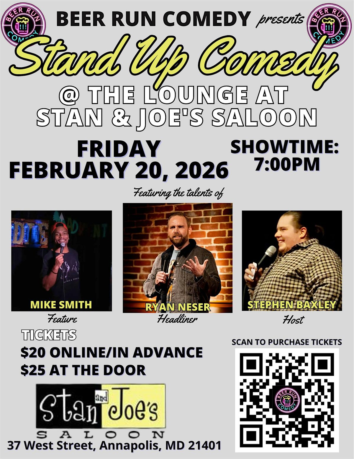 Beer Run Comedy, stand up comedy at its finest, presents their monthly series at The Lounge @ Stan and Joe's Saloon in Annapolis, MD on Friday February 20, 2026 at 7:00pm!!! The show will be headlined by Ryan Neser (DC Improv, Baltimore Laugh Factory)! Tickets are $20 online, and $25 at the door. So come to beautiful Annapolis for drinks and to enjoy what is sure to be a riotous evening of laughs!!!