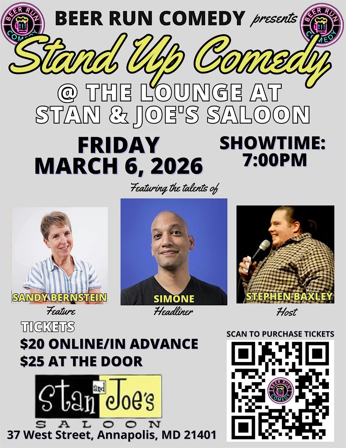 Beer Run Comedy, stand up comedy at its finest, presents their monthly series at The Lounge @ Stan and Joe's Saloon in Annapolis, MD on Friday March 6, 2026 at 7:00pm!!! The show will be headlined by Simone (DC Improv, The Stand NYC)! Tickets are $20 online, and $25 at the door. So come to beautiful Annapolis for drinks and to enjoy what is sure to be a riotous evening of laughs!!!