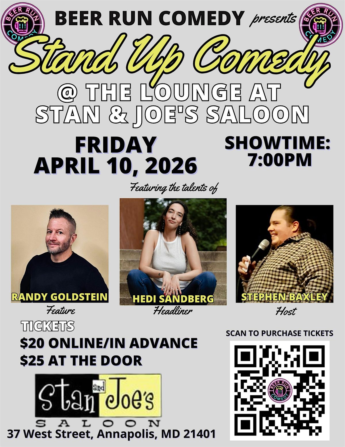 Beer Run Comedy, stand up comedy at its finest, presents their monthly series at The Lounge @ Stan and Joe's Saloon in Annapolis, MD on Friday April 10, 2026 at 7:00pm!!! The show will be headlined by Hedi Sandberg (DC Improv, Vermont Comedy Festival)! Tickets are $20 online, and $25 at the door. So come to beautiful Annapolis for drinks and to enjoy what is sure to be a riotous evening of laughs!!!