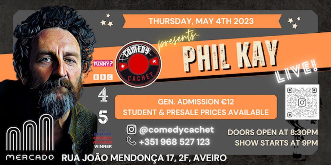 Tickets: https://www.eventbrite.com/e/stand-up-comedy-phil-kay-live-aveiro-tickets-605053209437