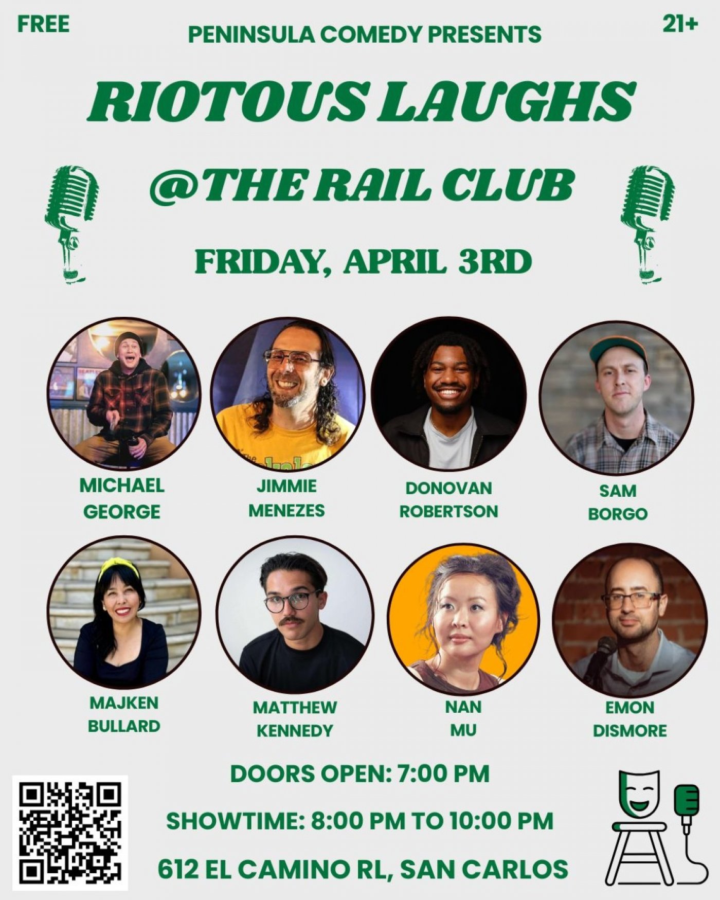 Feature Comedians: Michael George (Good Time Tavern), Donovan Robertson (Peninsula Comedy), Jimmie Menezes (Goldrush Comedy), Matthew Kennedy (Peninsula Comedy), Sam Borgo (Woodhams Lounge), Nan Mu (San Jose Improv), Majken Bullard (Comedy Night at Bruno's) and our headliner is Emon Dismore (Peninsula Comedy).