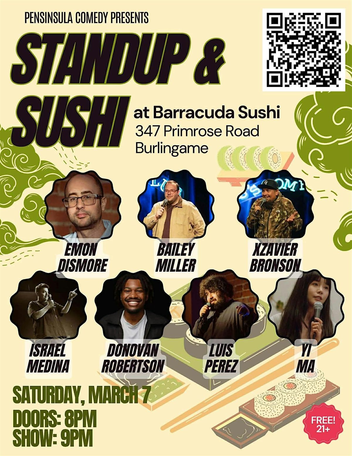 This comedy show is produced by Peninsula Comedy. Follow @peninsulacomedy or @emondismore if you're a fan of comedy and want to stay updated on future events. This show is happening on Saturday, March 7th from 9:00 pm to 10:30 pm. The feature comics on this lineup are Israel Medina (Peninsula Comedy), Donovan Robertson (Peninsula Comedy), Luis Perez (Empress Theater), Yi Ma (HaHa Cafe), Xzavier Bronson (San Jose Improv), Emon Dismore (Peninsula Comedy), and our headliner is Bailey Miller (Cobbs Comedy Club).