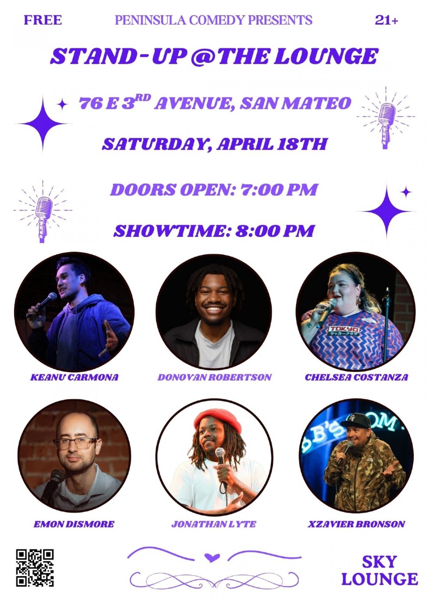 This show is happening on Saturday, April 18th from 8:00 pm to 9:30 pm. The feature comics on this lineup are Keanu Carmona (Laugh Track SF),Donovan Robertson (Peninsula Comedy), Chelsea Costanza (Woodhams Lounge), Jonathan Lyte (The Function), Xzavier Bronson (San Jose Improv), and our headliner is Emon Dismore (Peninsula Comedy). Emon is a Bay Area Born & Raised comedian who's "Man on the Street" style interviews has amassed over 40 million views across instagram alone. Join us in this night that will be full of fun and laughter! This comedy show is produced by Peninsula Comedy. Follow @peninsulacomedy if you're a fan of comedy and want to stay updated on future events.