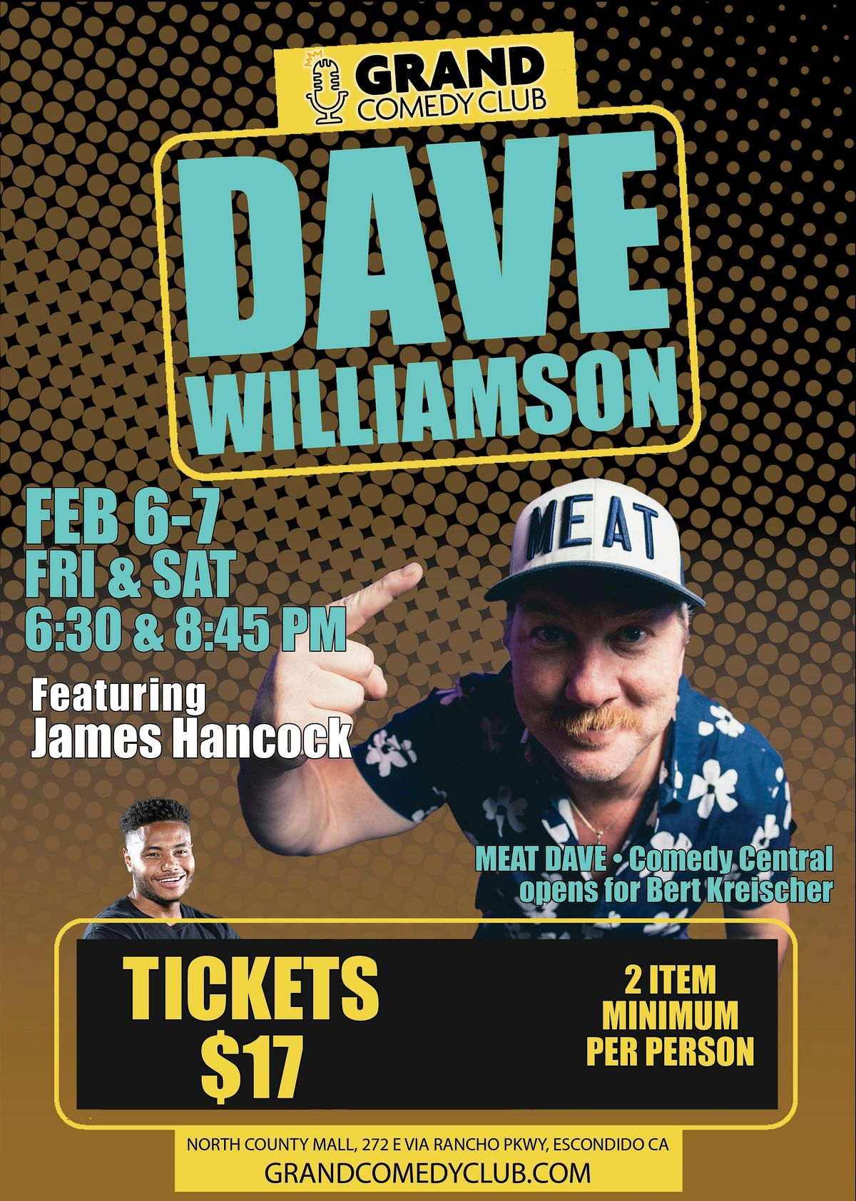 Get ready for an epic night of laughs in person! Join us at the Grand Comedy Club Escondido for some hilarious stand-up featuring the talented DAVE WILLIAMSON and friends. (Comedy Central, Netflix, Nbc) Discounted price while supplies last! 2 item minimum purchase per person. 18 and up. No changes or refunds.