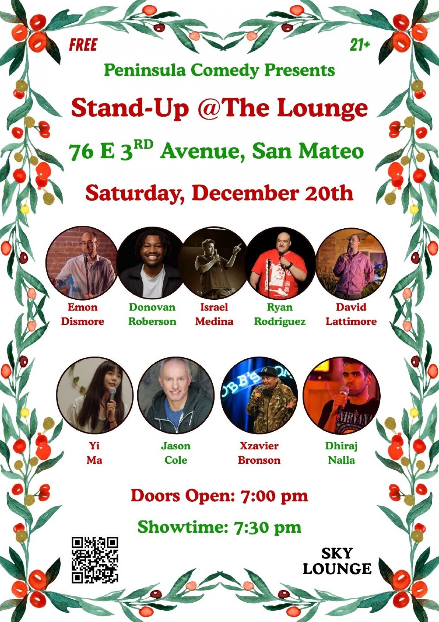 Welcome to the BEST & ONLY Stand-Up Comedy Show in Downtown San Mateo, Stand-Up @The Lounge at Sky Lounge. This is the third installment of "Stand-Up @The Lounge," with these shows consistently hitting full capacity. The art-form of Stand-Up Comedy has found a new home in this elegant and beautiful space. This venue has a full-service bar and if you're in the mood for a bite, is conveniently located Nextdoor to an Indian restaurant. Enjoy some hand-crafted cocktails, fresh samosas, and top local talent. This comedy show is produced by Peninsula Comedy. Follow @peninsulacomedy or @emondismore if you're a fan of comedy and want to stay updated on future events. This show is happening on Saturday, December 20th from 7:30 pm to 9:30 pm. The feature comics on this lineup are Donovan Robertson (Roast Battle League), Ryan Rodriguez (Tommy T's), David Lattimore (Comedy Oakland), Israel Medina (Rooster T Feather's), Jason Cole (SF Punchline), Dhiraj Nalla (San Jose Improv), Yi Ma (HaHa Cafe), and our headliner Xzavier Bronson (San Jose Improv).