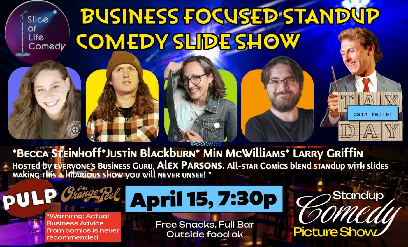 Tax Day getting you down? Find the funny side of your business when comics on the show do stand up with slideshow pictures to illustrate their sets, ridiculously explaining their interpretation of occupations. This is sure to keep you in your seats figuring out what you just looked at!