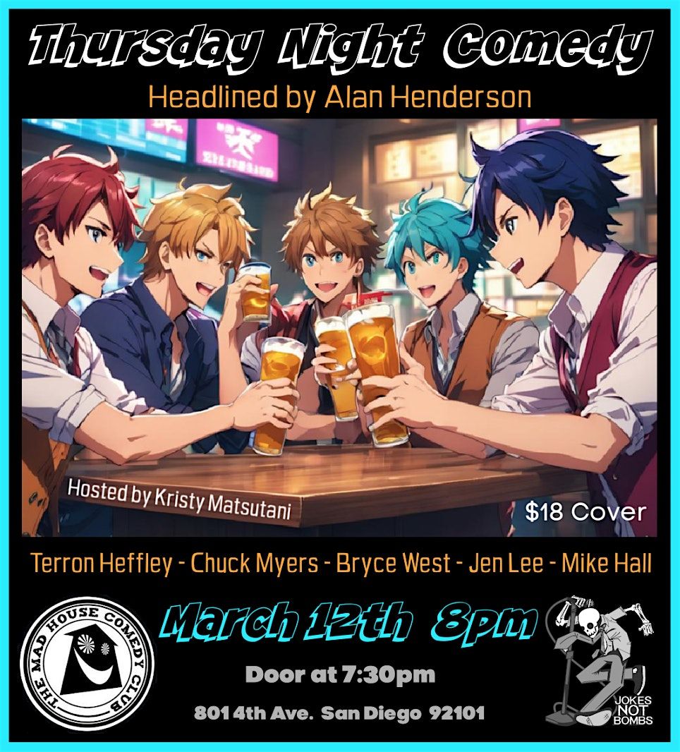 The Mad House Comedy Club has been a staple of the San Diego comedy scene since 2011 and we've got an incredible show coming your way headlined by Alan Henderson. He was born and raised here in San Diego, is a regular at the Comedy Store in La Jolla, has been seen on the BBC and has headlined countless shows all along the west coast. Come check out a great lineup of comedians on the 12th!