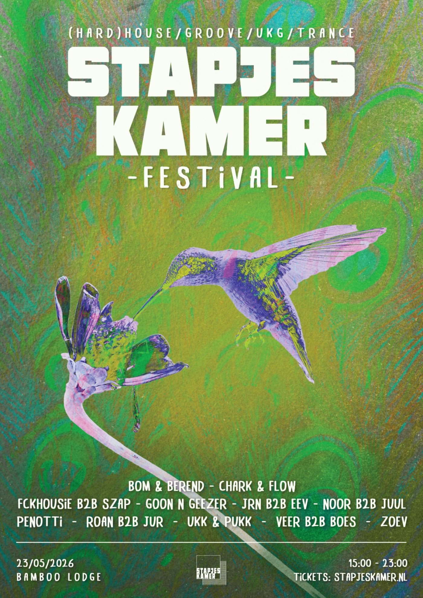 Na het grote succes van onze editie vorig jaar in de Bamboo Lodge, keren we dit jaar weer terug, en dit jaar pakken we het nog groter aan met onze eigen Stapjeskamer festival in het vernieuwde Bamboo Lodge. Kom 23 mei met ons genieten van de lente en de hele dag dansen op deze prachtige locatie!