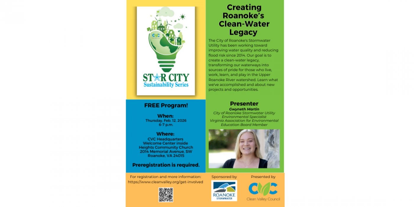 Gwyneth Martin, City of Roanoke Stormwater Utility Environmental Specialist, will be the Star City Sustainability Series presenter on Thursday, Feb. 12, from 6-7 p.m., at Clean Valley Council Headquarters.