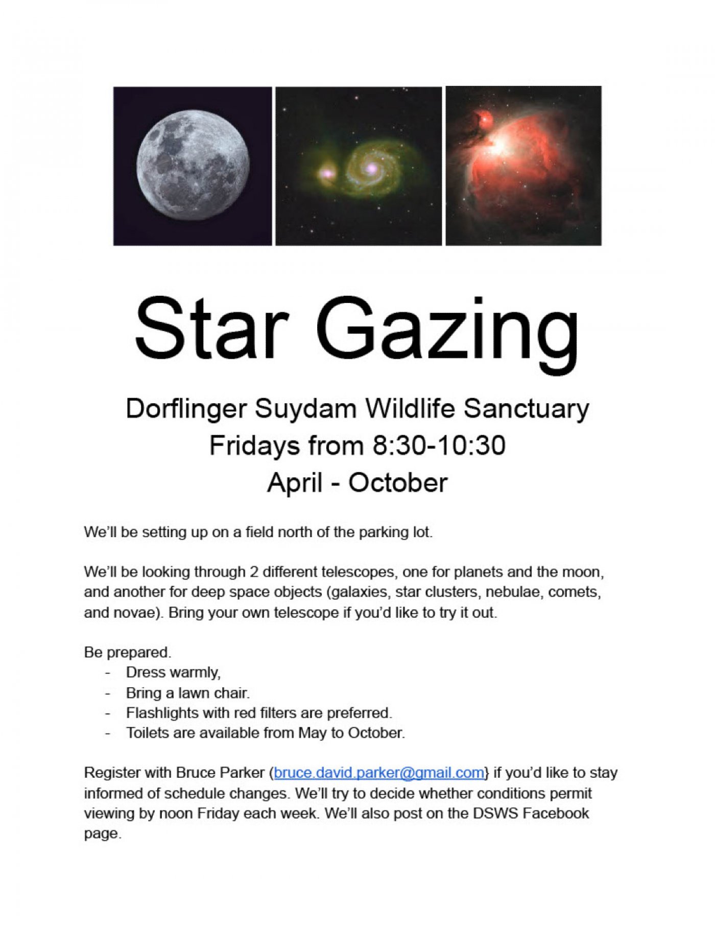 Register with Bruce Parker ([email protected]) if you’d like to stay informed of schedule changes. We’ll try to decide whether conditions permit viewing by noon Friday.