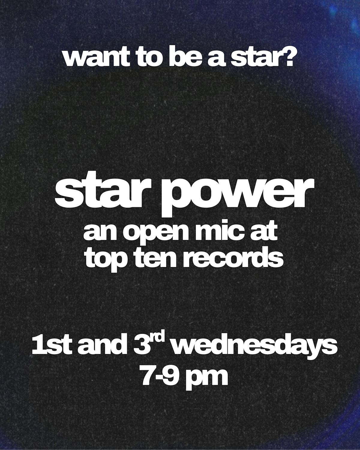 star power open mic is for a training ground for those who want to shine. happening 1st & 3rd wednesdays at the historic top ten records, star power is a place to convene with stars and test out material. acoustic music. stand up comedy. poetry. insprational speeches?