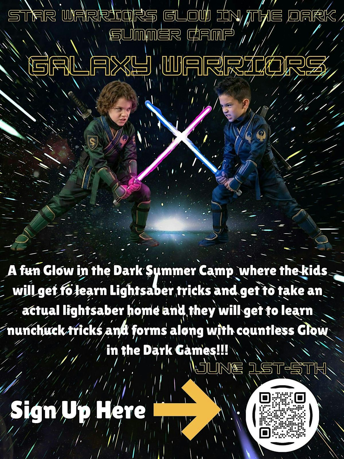 Dates: June 1st – June 5th Step into a galaxy far, far away! 🌌 This high-energy camp takes martial arts to the cosmic level. Students will train in a "glow-in-the-dark" environment, mastering epic lightsaber tricks and nunchuck forms. Camps are $199 for Monday-Friday 8 am - 4pm Campers bring water bottle and sack lunch. Pay a $50 deposit today and pay the rest the friday before Summer Camp Starts.
