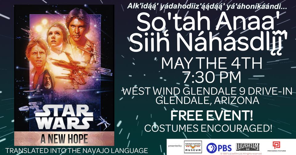 Navajo Nation Museum and Providence Pictures are partnering to bring a special screening of the Navajo Language Version of Star Wars: A New Hope (with English subtitles) to celebrate a national day dedicated to Star Wars fans. This is a FREE event and costumes are encouraged! Meet the Navajo voice cast!