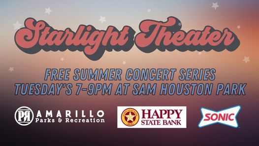 Starlight Theater is back for another fantastic lineup all summer long! Join Amarillo Parks & Recreation Tuesday evenings at Sam Houston Park from 7PM to 9PM for free music, local food trucks, vendors and family friendly fun! Special thank you to the following sponsors for making this event possible: Happy State Bank and Sonic Amarillo!