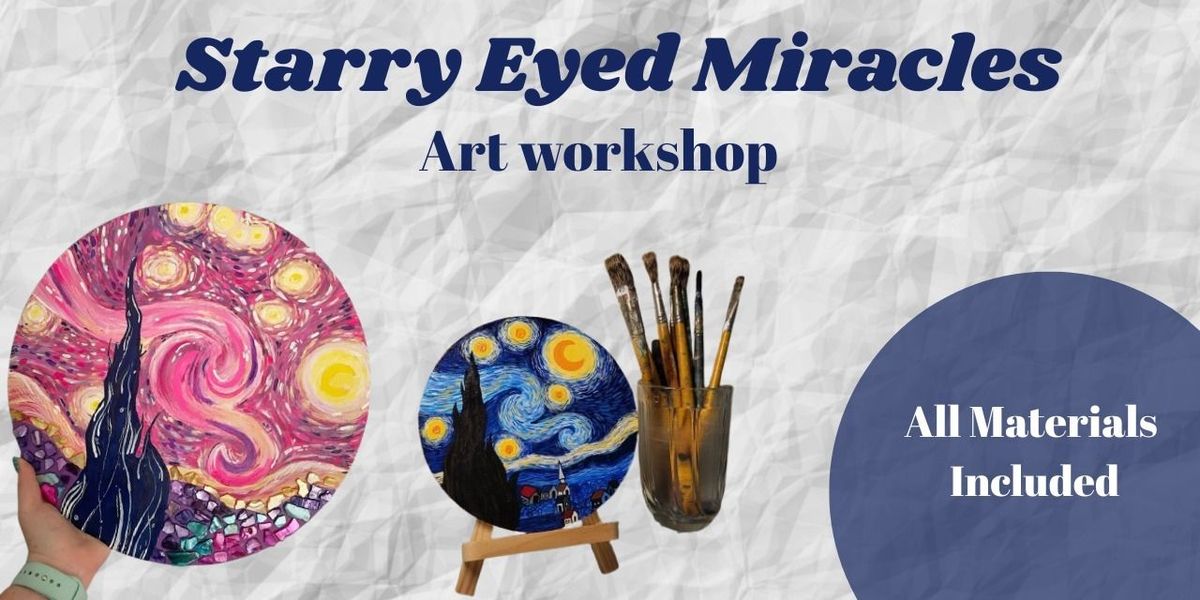 Welcome to Starry Eyed Miracles, where dreamy blues, golden stars, and gentle music set the tone for a perfect art-café evening. Create your own starry masterpiece with all materials provided paint under imaginary skies. 🌟🖌️