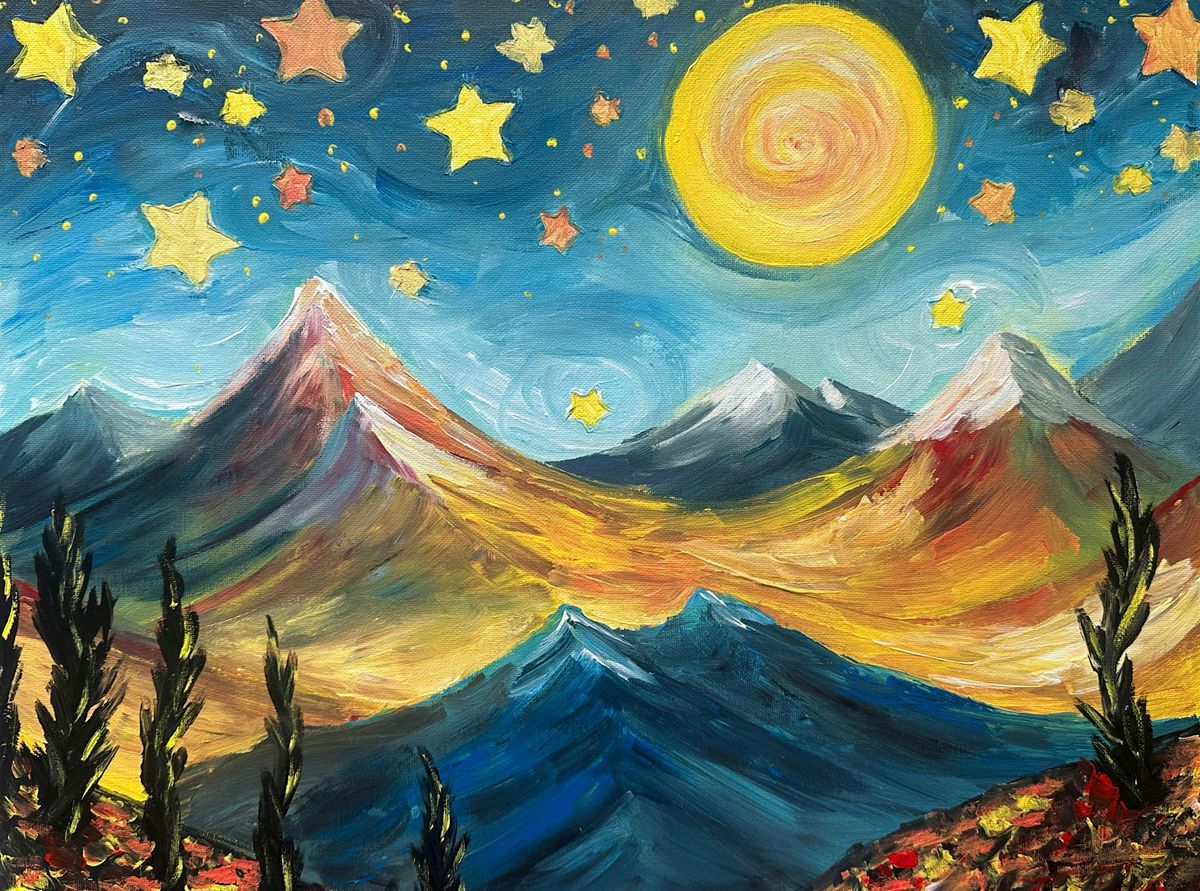 Come join in on painting a breathtaking mountain scene under a starry night, with your favorite beverage!