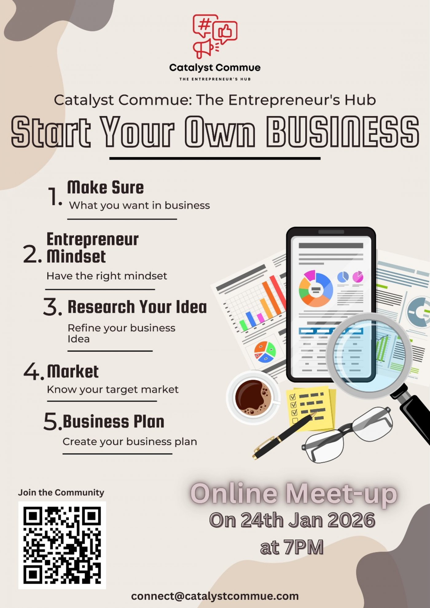 Get ready to ignite your entrepreneurial spirit at the "Start Your Own Business" event hosted by Catalyst Commue: The Entrepreneur's Hub.