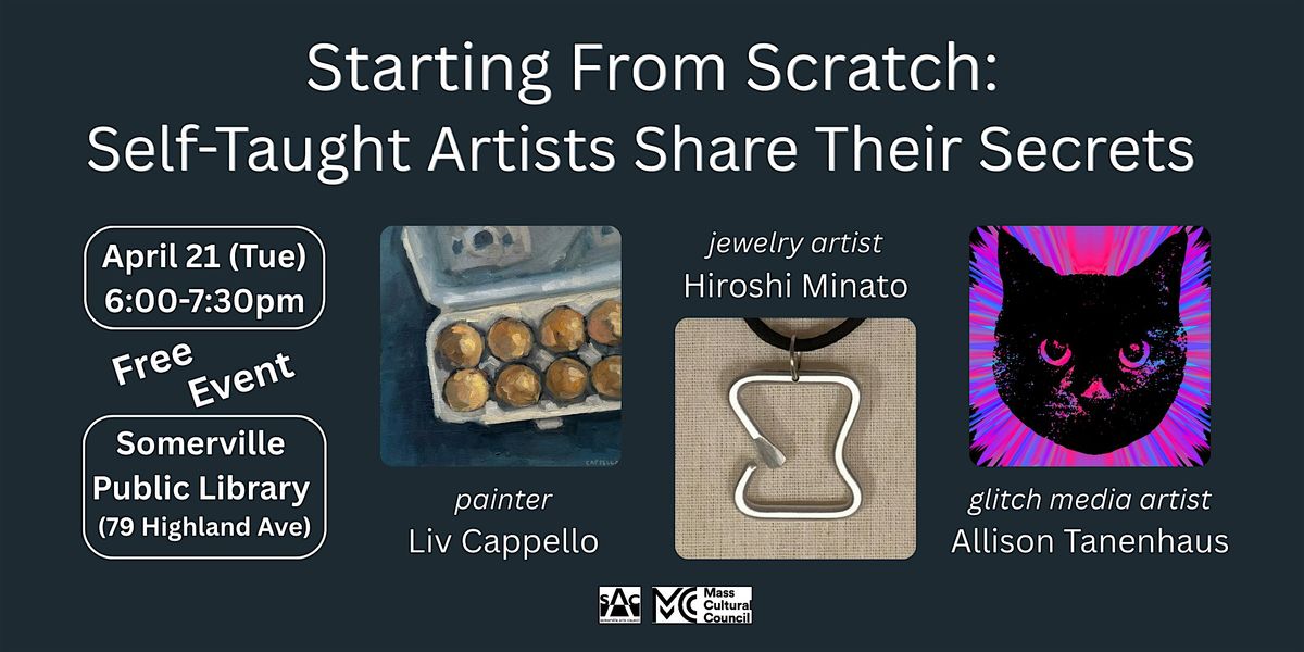 Join us for a lively and inspiring panel discussion featuring local artists Liv Cappello (painter), Hiroshi Minato (jewelry artist), and Allison Tanenhaus (glitch media artist). They are recent recipients of the Somerville Arts Council Visual Art Fellowship. None of them have formal art education, but have learned how to successfully navigate the art world.