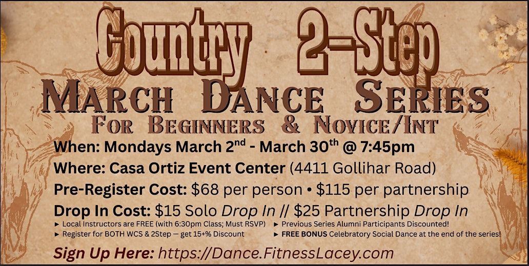 Get ready to kick up your boots and learn some country 2-step moves in this MARCH MONDAY series - bonus week included!