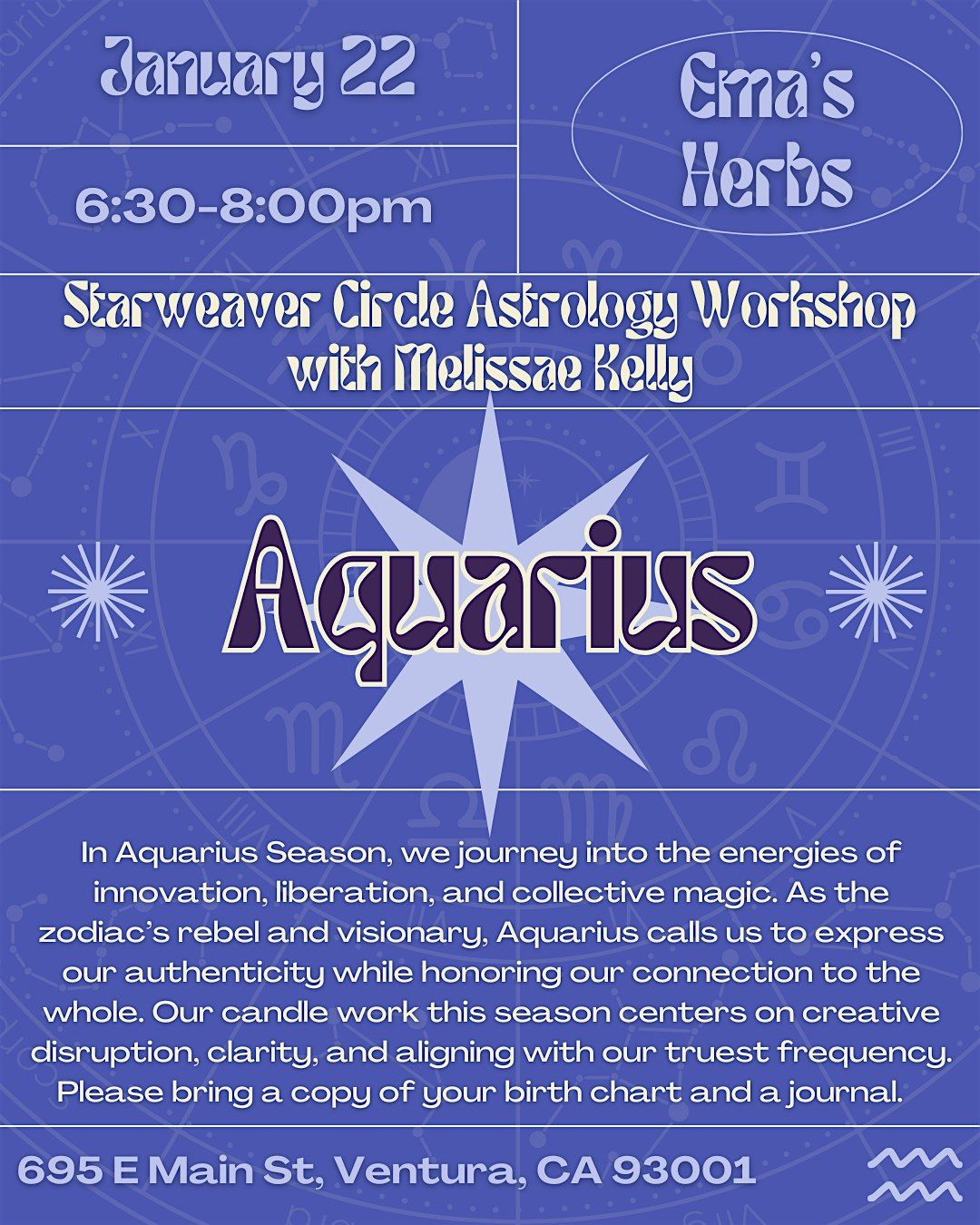 Each month in the Starweaver Circle, we explore the current zodiac season and how itβs showing up in your chart, your rituals, and your life. Whether you're brand new or deeply immersed in astrology, this circle is open to all levels. In Aquarius Season, we journey into the energies of innovation, liberation, and collective magic. As the zodiacβs rebel and visionary, Aquarius calls us to express our authenticity while honoring our connection to the whole. Together, weβll craft intention candles aligned with both the new and full moons of the season. Our candle work this season centers on creative disruption, clarity, and aligning with our truest frequency. Please bring a copy of your birth chart and a journal.