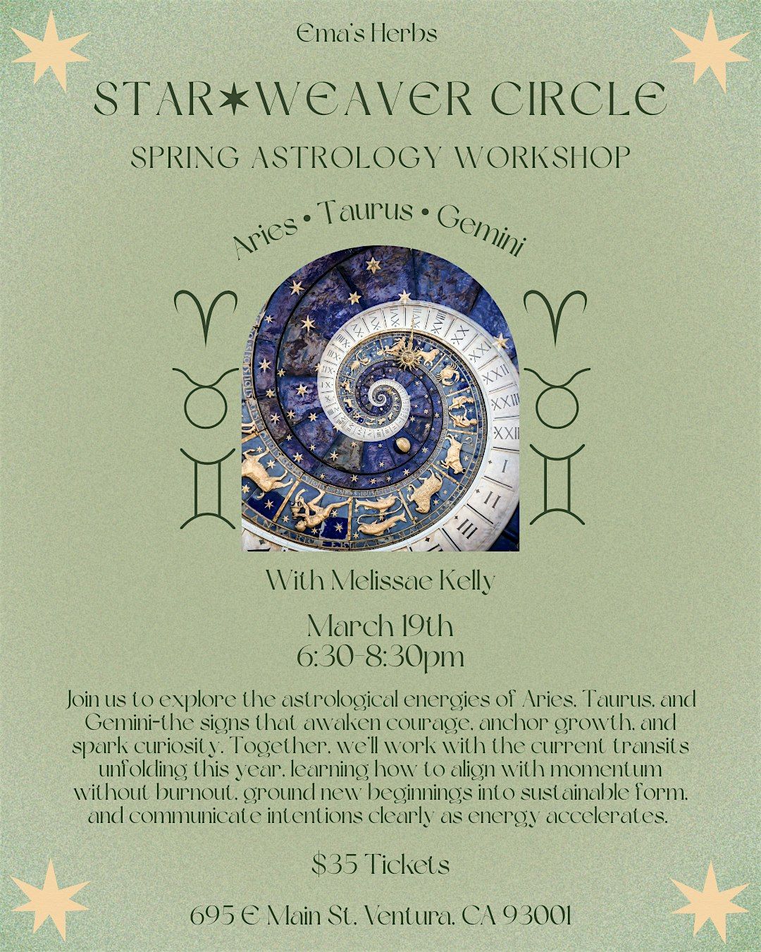 Spring is the season of initiation, embodiment, and movement. In this Starweaver Circle astrology workshop, we’ll explore the astrological energies of Aries, Taurus, and Gemini—the signs that awaken courage, anchor growth, and spark curiosity! Together, we’ll work with the current transits unfolding this year, learning how to align with momentum without burnout, ground new beginnings into sustainable form, and communicate intentions clearly as energy accelerates. This workshop focuses on practical ways to work with the season, using astrology as a tool for timing, self-awareness, and conscious action. Each Starweavers workshop includes a simple, hands-on craft and a guided ritual that we will do together during the session. All materials and supplies are included.