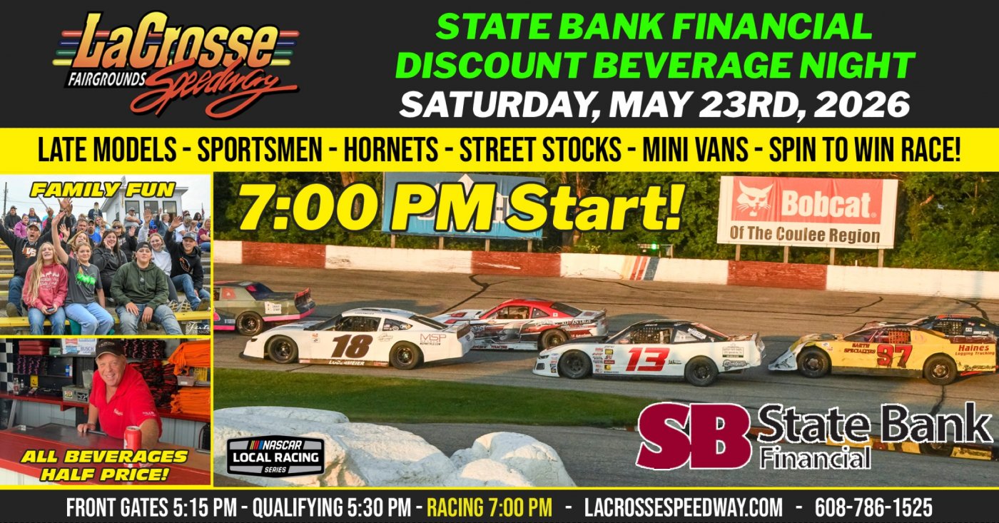 Get ready for a night of high‑octane racing, unbeatable drink specials, and family FUN at LaCrosse Speedway in West Salem, Wisconsin! Join us on Saturday, May 23rd, 2026 at 7:00 PM for State Bank Financial Throttle and Thirst Discount Beverage Night, where ALL beverages are 1/2 price all night long — the perfect way to kick off Memorial Day weekend at the track.