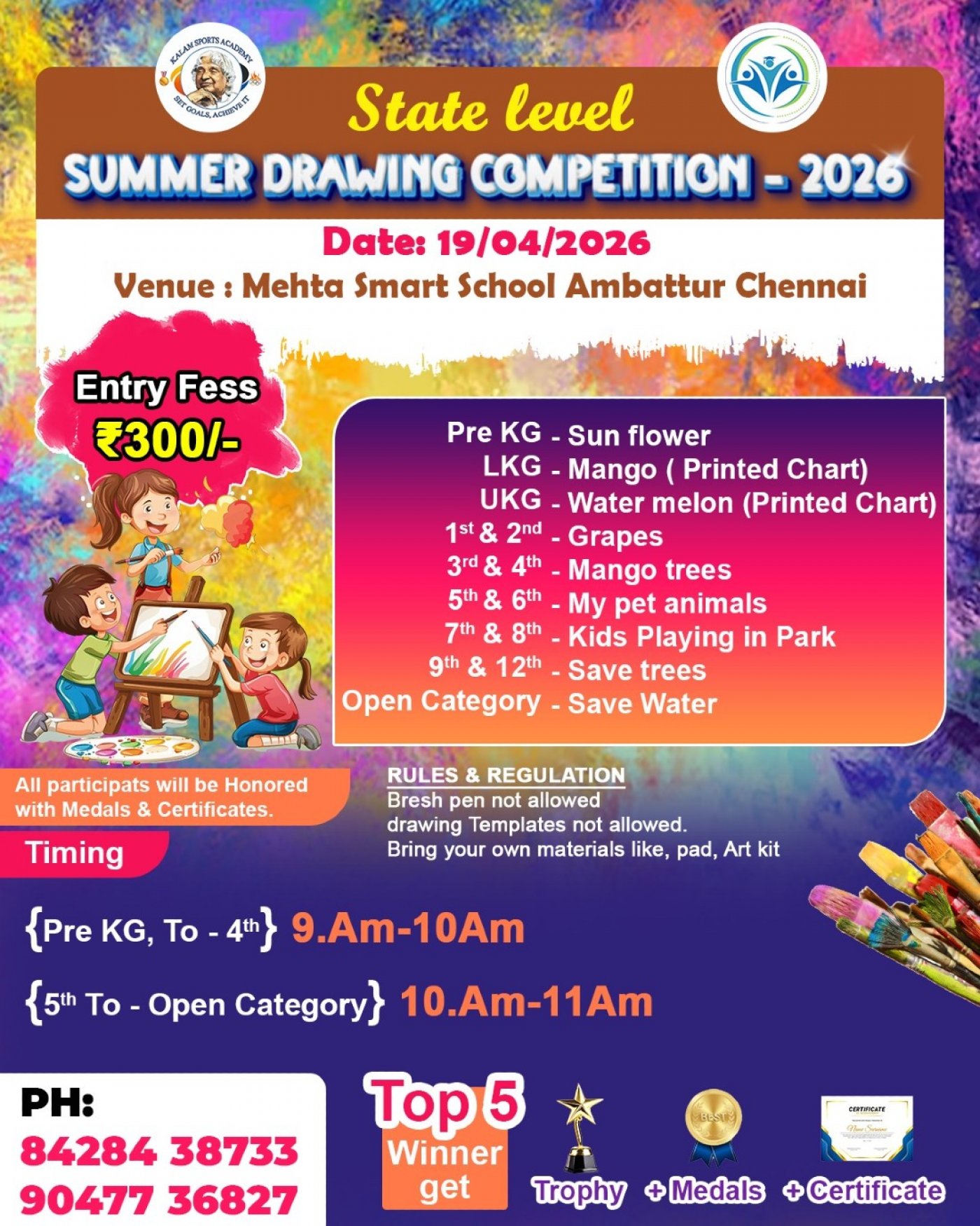 Kalam Event Management presents State Level Summer Drawing Competition Apr 2026 held on 19th Apr at Dr. Mehta's International Smart School | Vanagaram (Behind Decathlon, Nolambur)