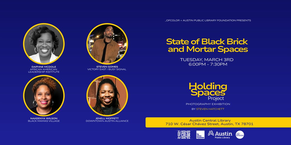 As part of the Holding Spaces exhibition, The State of Black Brick-and-Mortar Spaces in Austin convenes Black business owners, organizers, and space-holders for an honest, grounded conversation about what it takes to operate and sustain physical spaces today.