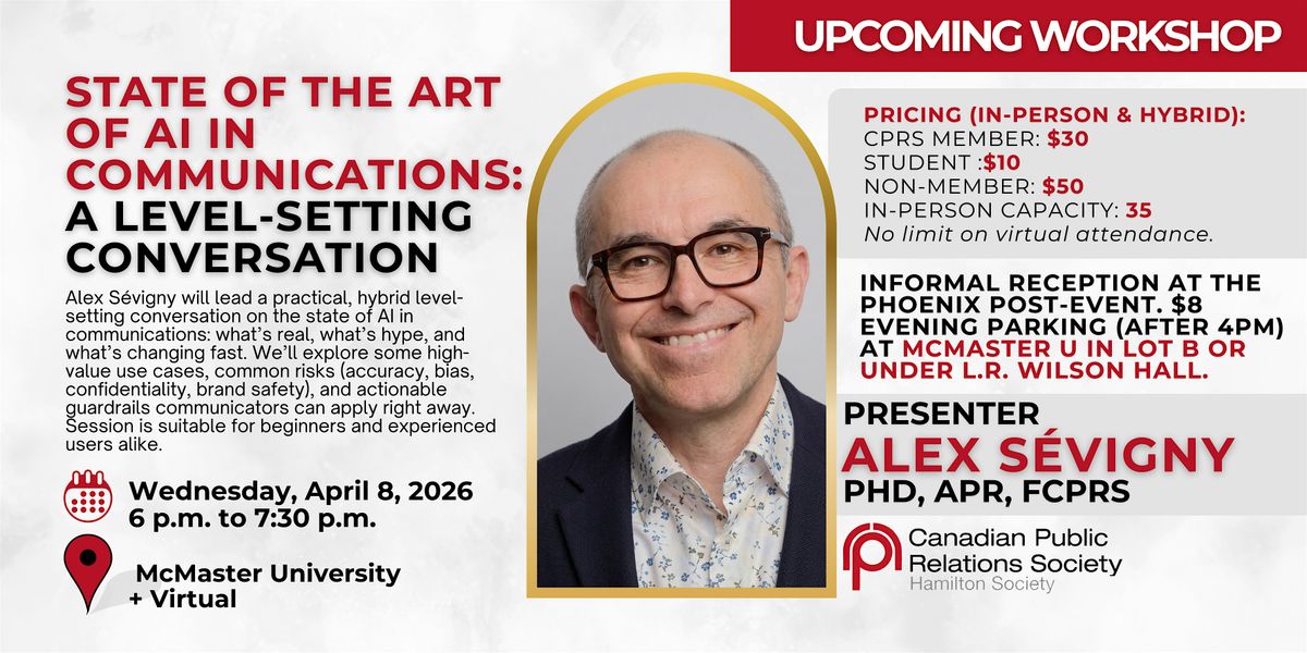 AI is no longer a “future trend” in communications, it’s a shifting set of tools, risks, and opportunities that communicators are being asked to understand right now. This 90-minute, hybrid (in-person and virtual) professional development session is designed as a practical level-setting conversation for CPRS Hamilton members and any other communicators who would like to join, whether you’ve experimented with generative AI daily or haven’t touched it yet.