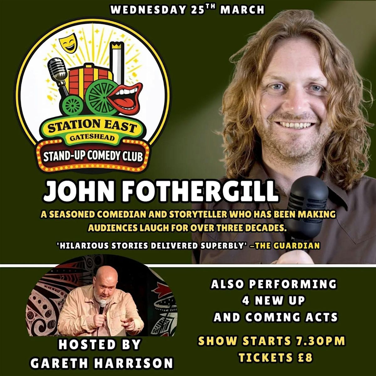 Hosting the night is comedian Gareth Harrison and he will introduce 4 new acts to the mic before John rocks the mic