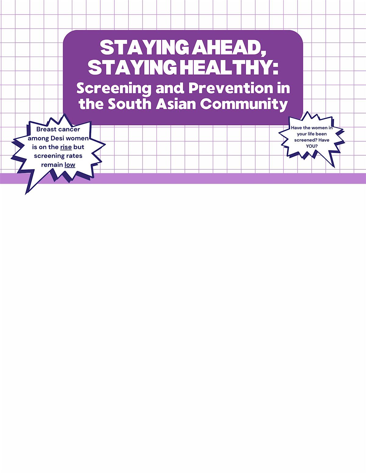 Join us in person for "Staying Ahead, Staying Healthy: Screening and Prevention in the South Asian" – a fun and friendly event focused on keeping you informed about health screenings and prevention tailored just for the South Asian community. It's all about empowerment, education, and taking charge of your wellness. Don’t miss out on tips and talks that can make a real difference!