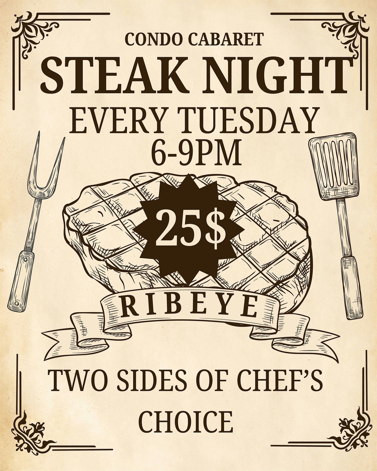 Steak night at Condo Cabaret, ribeye served with 2 sides of Chef's choice