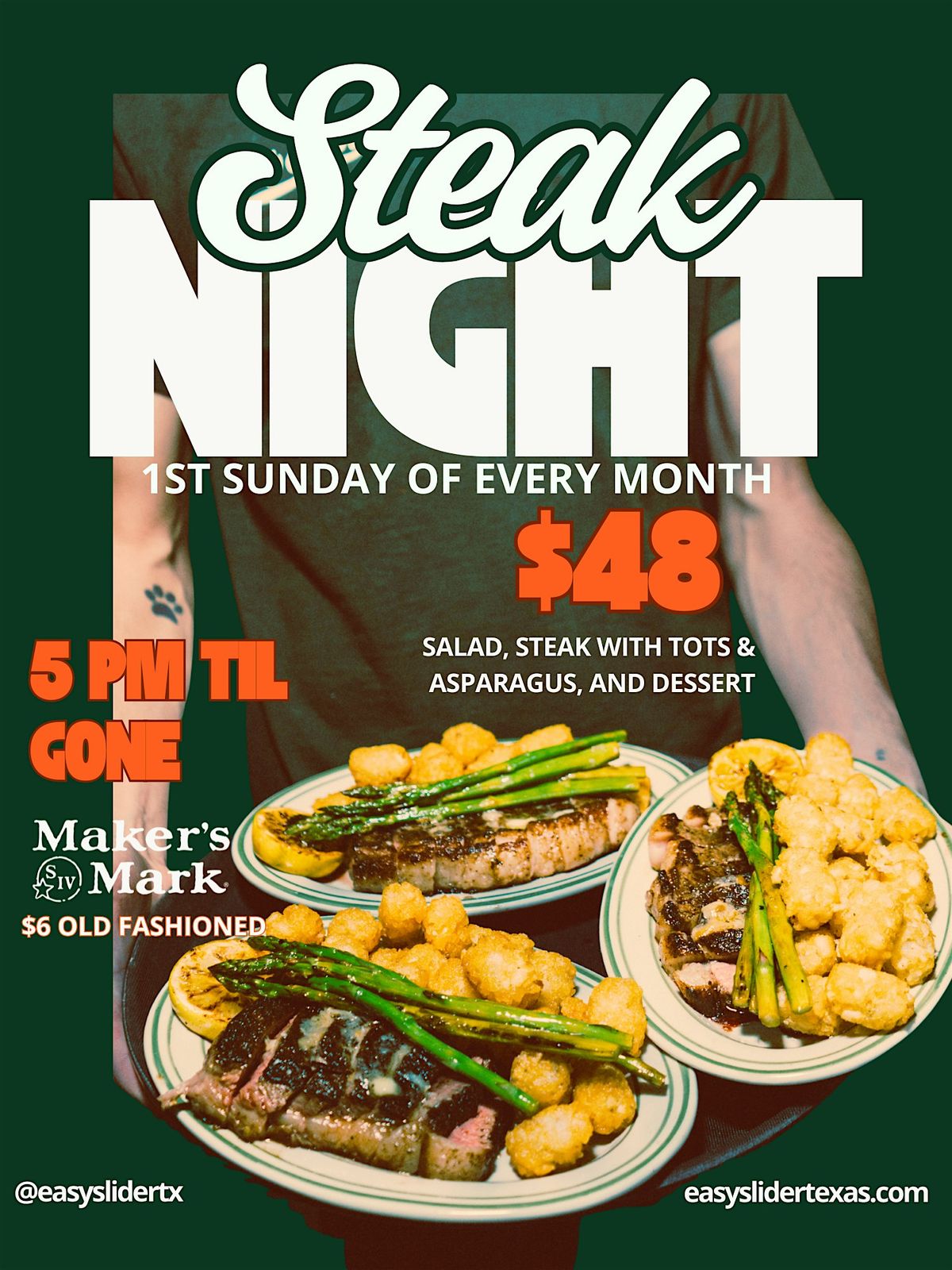 Steak Night is calling your name! Sunday, May 3rd from 5–9PM at Easy Slider on East Side Ave. $48 gets you salad, steak, tots, asparagus, and dessert. And $6 Old Fashioned all night long.