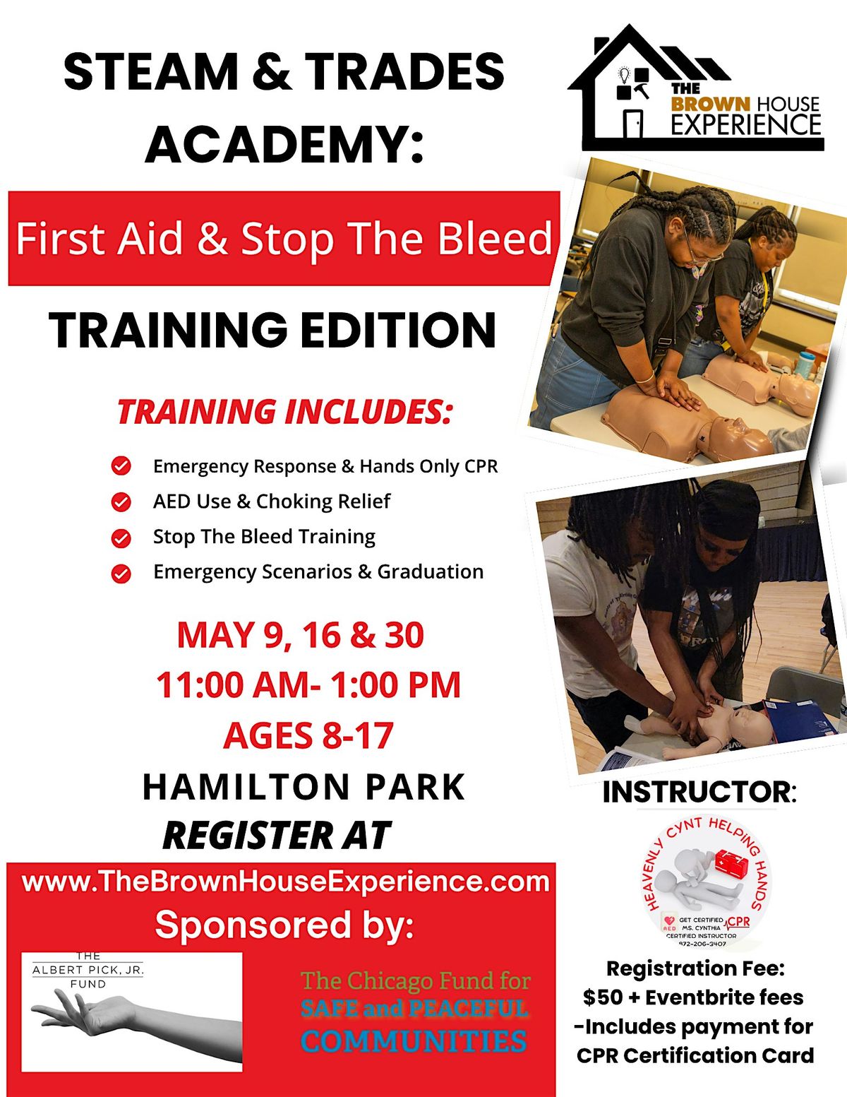 -Pictures & videos will be taken during our STEAM & Trades Academy- CPR & Stop The Bleed Training Edition. In order for your child to participate, you must agree to our photography/videography waiver: I understand that The Brown House Experience, Heavenly Cent and TBHE affiliates may use the images in print publications, online publications, presentations, websites, and social media. I also understand that no royalty, fee or other compensation shall become payable to me by reason of such use.