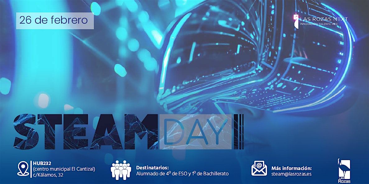 STEAM Day Las Rozas es una iniciativa de la Concejalía de Economía, Innovación y Empleo del Ayuntamiento de Las Rozas. El objetivo de la jornada es ayudar a los estudiantes de una forma práctica a conocer mejor las opciones formativas que tienen a su alcance, tanto universitarias como de Formación Profesional.