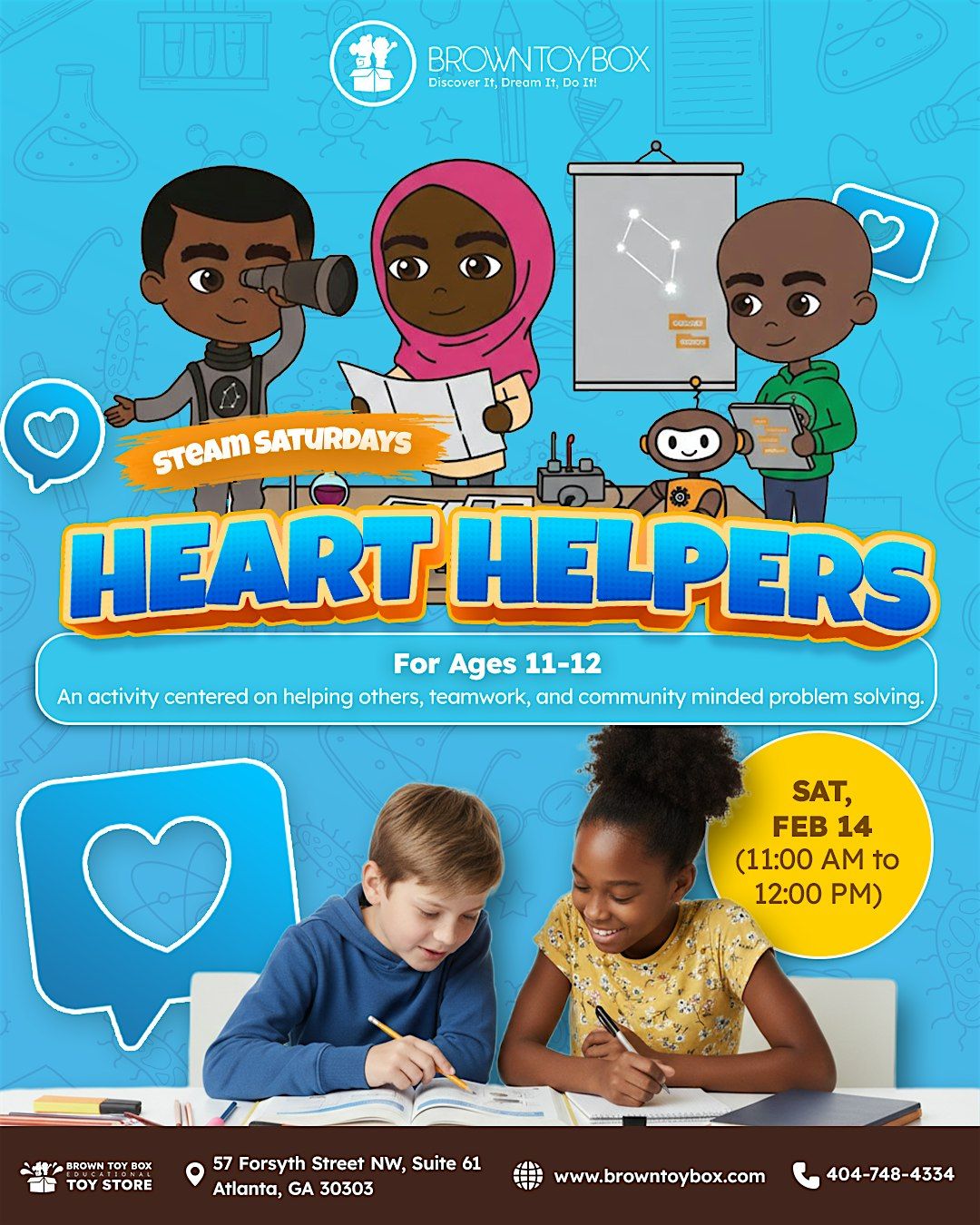 Heart Helpers is a STEAM Saturday experience focused on social emotional learning teamwork and community impact. Students will work together through interactive challenges that encourage helping others collaboration and creative problem solving. This session blends science technology engineering art and math with heart centered learning to build confident compassionate leaders.