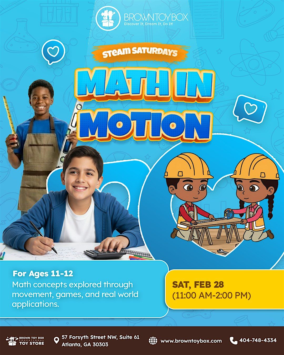 Math in Motion is a high energy STEAM Saturday designed to help students understand math in a fun active and engaging way. Through movement based games hands on challenges and real world scenarios students will explore key math concepts while building confidence collaboration skills and critical thinking.