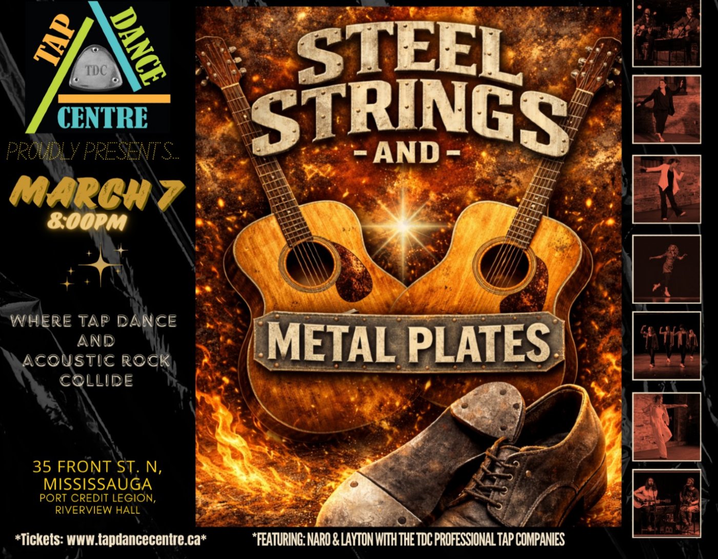 Celebrating more than 15 years, Canada’s premier Tap Dance Centre (TDC) announces a new collaborative production titled ‘Steel Strings and Metal Plates,’ featuring Toronto acoustic guitar duo ‘Naro & Layton’ and TDC founder/director Kim Chalovich, plus pro dancers, faculty, choreographers and more at Riverview Hall, Port Credit Legion in Mississauga, ON on Saturday, March 7 -- Doors at 7:30 p.m. / Show at 8:00 p.m.!