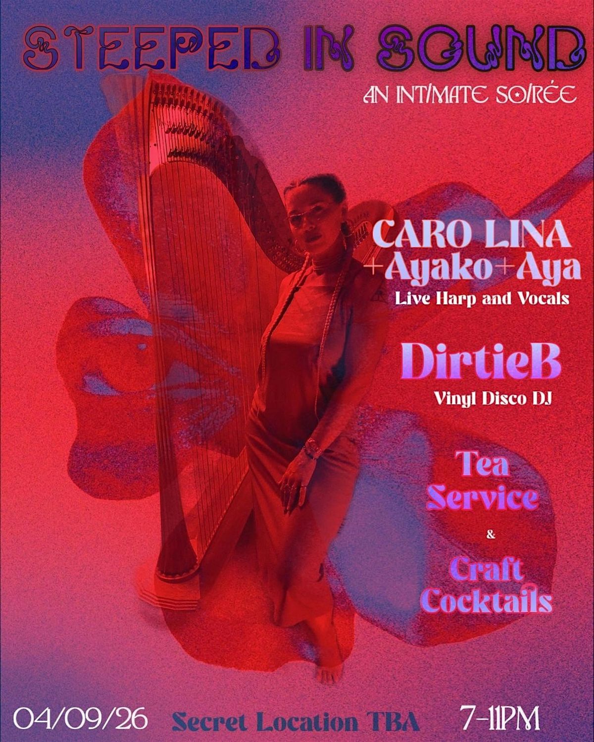 On Thursday, April 9th, step into a space designed for slowing down and tuning in. Steeped in Sound brings together live harp with layered vocals, tea service, and vinyl selections for a night that is meant to be both grounding and transportive.
