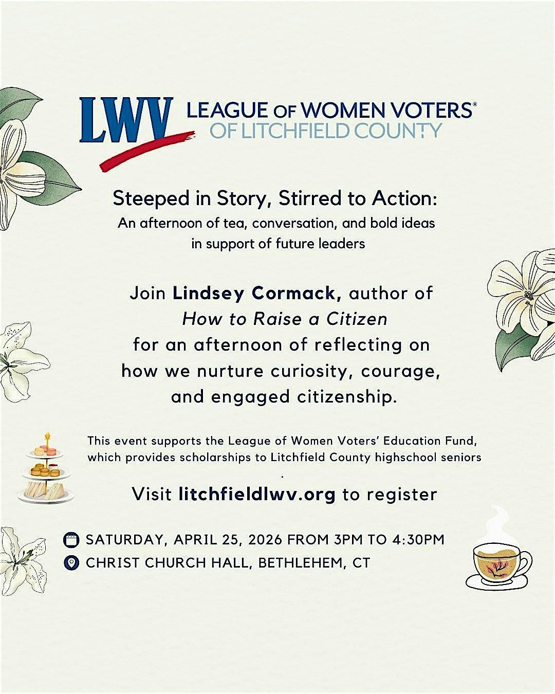 Join us for a spirited spring tea in support of the League of Women Voters’ Education Fund, which provides scholarships to Litchfield County high school seniors preparing to become thoughtful, engaged citizens.