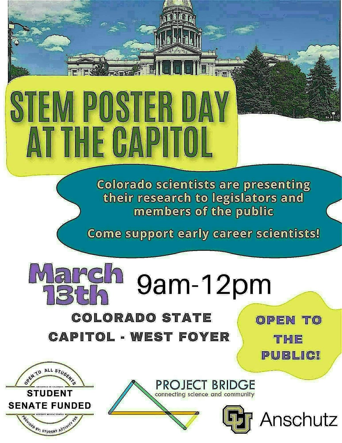 Join us at the Colorado State Capitol - West Foyer for a fun and inspiring day showcasing amazing scientific posters presented by young scientists in CO! It's happening on March 13th, 2026, at 9:00 AM -12:00 PM (Mountain Time). Come check out creative posters, chat with students, and get inspired by the future of science and tech. Don’t miss out on this cool event right in the heart of Denver!