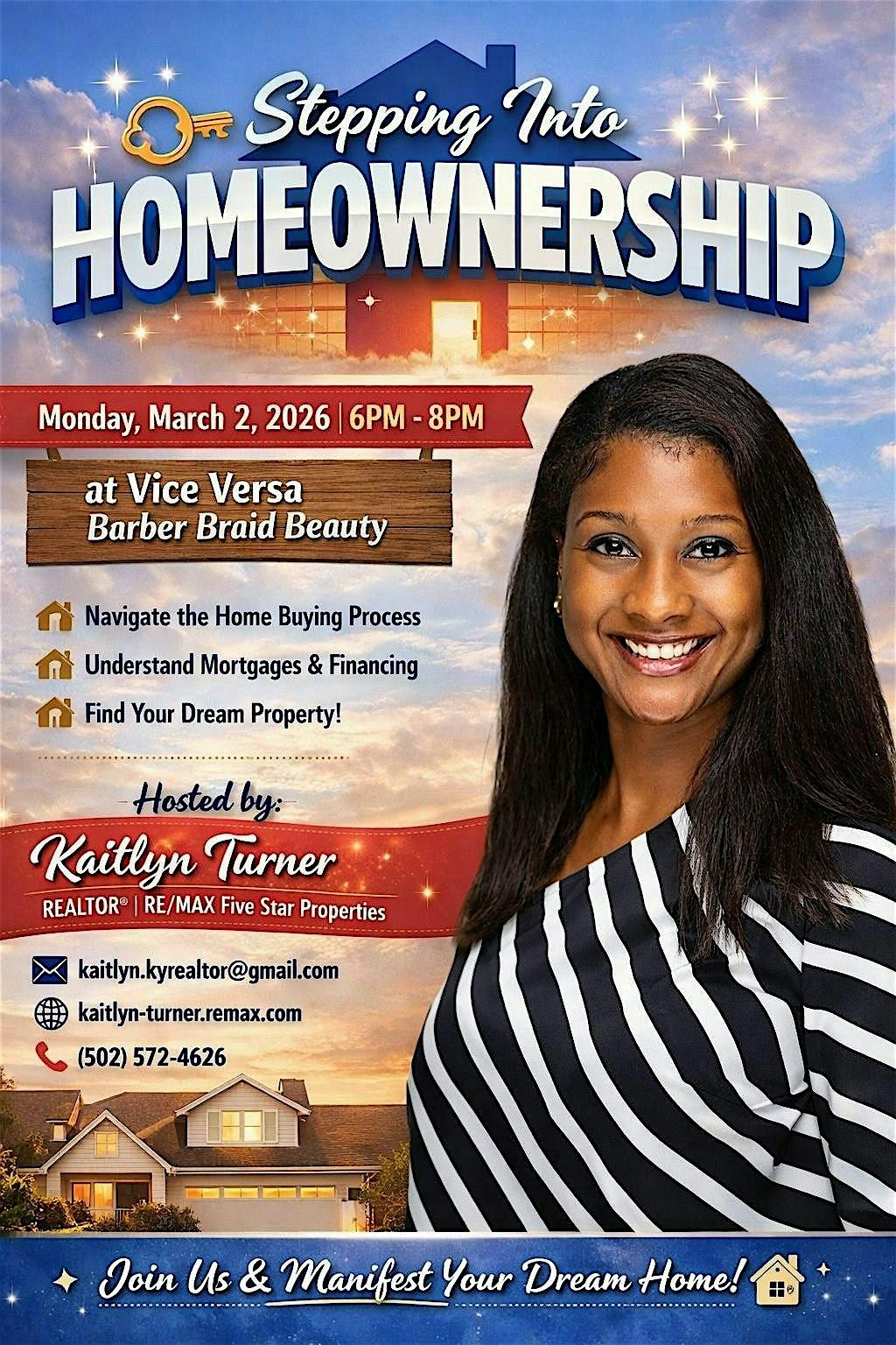 Join us Monday, March 2, 2026, from 6 PM – 8 PM at Vice Versa Barber Braid Beauty for an exclusive Meet & Manifest event focused on real estate and first-time home buying!