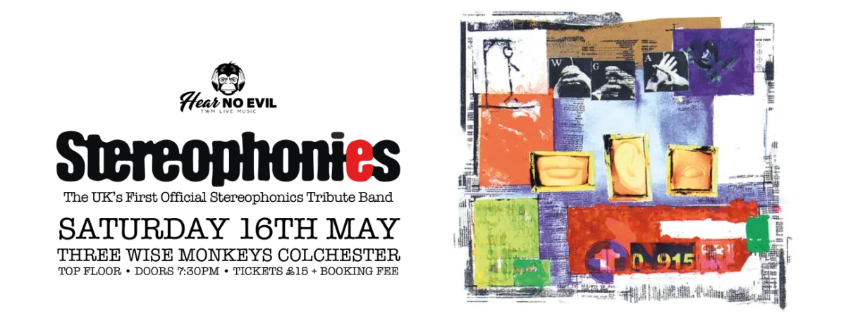 Back by popular demand! TWM Live presents Stereophonies – The UK’s first, original and best Stereophonics tribute act – at Three Wise Monkeys Colchester on Saturday 16th May.Playing tribute to the mighty welsh rockers who were the 8th group to achieve 5 consecutive UK number 1 albums in a list that includes the Beatles, Led Zeppelin, ABBA, Genesis, Oasis, Blur and U2. The Stereophonics enjoyed 11 top 10 singles including the number 1 single ‘Dakota’. Their hits collection, ‘Decade In The Sun’, sold 1.2 million copies in the UK.Tickets are on sale now, advance booking advised as this show sold out last time!Advance tickets £15 + booking fee Doors 7:30pmPlease note that access to the top floor of Three Wise Monkeys does not have a lift, but there are rest opportunities between each flight of stairs.Viewer discretion is advised: This show may potentially contain flashing and strobing lighting effects.We wanted to inform you of our refund policy regarding event tickets. Please note that we will be unable to process any ticket refunds within 7 days of the event.We understand that circumstances may arise that prevent you from attending the event, but unfortunately, we are unable to accommodate refund requests within this timeframe.