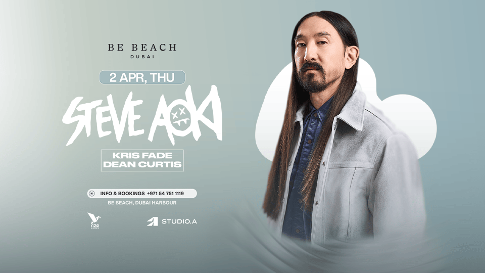 - Be Beach Dubai welcomes Steve Aoki for a high-energy night defined by explosive drops, iconic anthems, and an electrifying beachfront atmosphere. Known worldwide for his dynamic performances and genre-blending sound, Steve Aoki delivers an unforgettable show where music, production, and crowd energy collide. Supporting the night are Kris Fade and Dean Curtis, setting the tone with powerful sets leading into an unmissable headline performance. Expect a night of full-scale production, immersive visuals, and non-stop energy against the backdrop of Dubai Harbour.